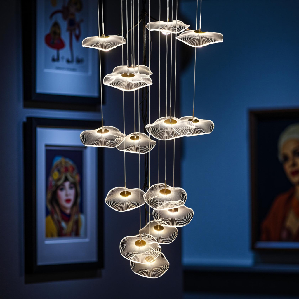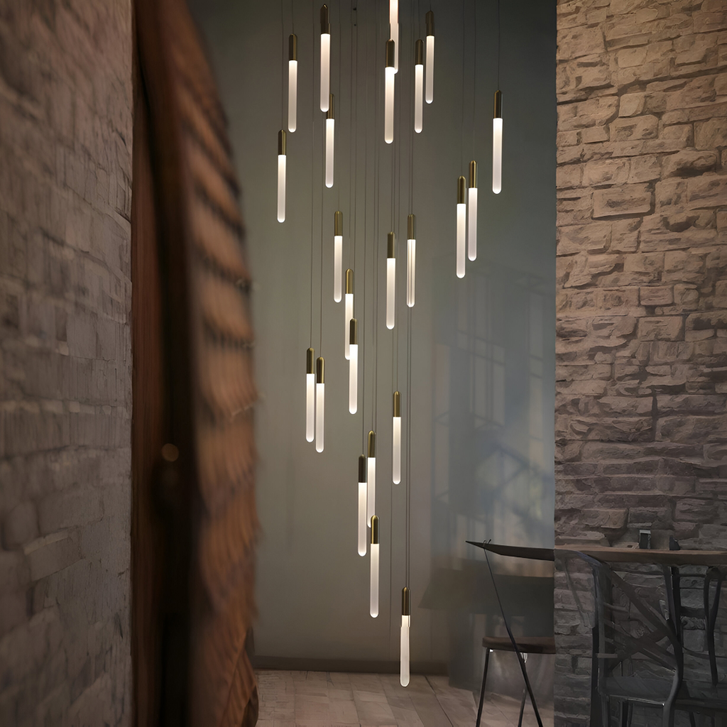 - پر کردن فضای عمودی: این لوسترها با استفاده از کابلهای آویز بسیار بلند، یک مسیر نوری زیبا از سقف تا نزدیکی طبقه پایین ایجاد میکنند. مدلهای چندخطی یا چندشاخه که هر خط در ارتفاع متفاوتی قرار میگیرد، به طور مؤثری حجم بصری فضا را پر میکنند.